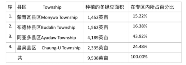 按:绿豆是缅甸三大出口豆类之一,过去此绿豆只作为冬作物在下缅甸地区种植,现在这绿豆种植工作已扩大到上缅甸阿仰(Ahnya)地区来种植了。阿亚多县区所在的蒙育瓦专区也广泛种植此绿豆,在2023—24财政年度冬作物种植季节期间全专区就种植了此绿豆9,538英亩,每英亩绿豆产量达到16缅箩,其中以阿亚多县区种植面积为最多(见《缅华网》2024年5月23日“缅甸新闻”栏目中的有关报导)。当时专区各县区在2023年冬季期间种植的冬绿豆面积如下表: