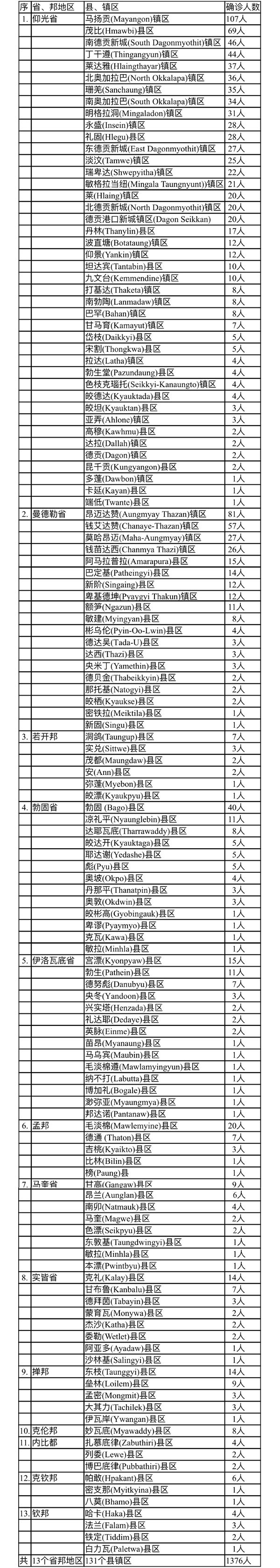 缅甸卫生暨体育部12月12日下午6时发出公告,通告12月11日这一天发现的1376名确诊者的一些情况。这1376名确诊者来自13个省邦地区,他们所属的县镇地区如下: