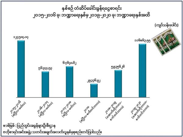 12月11日出版的《缅甸之光》刊登出了两幅图表,介绍缅甸最近几个财政年度征收到的印花税及个人所得税。具体数据如下表(单位:缅元):
