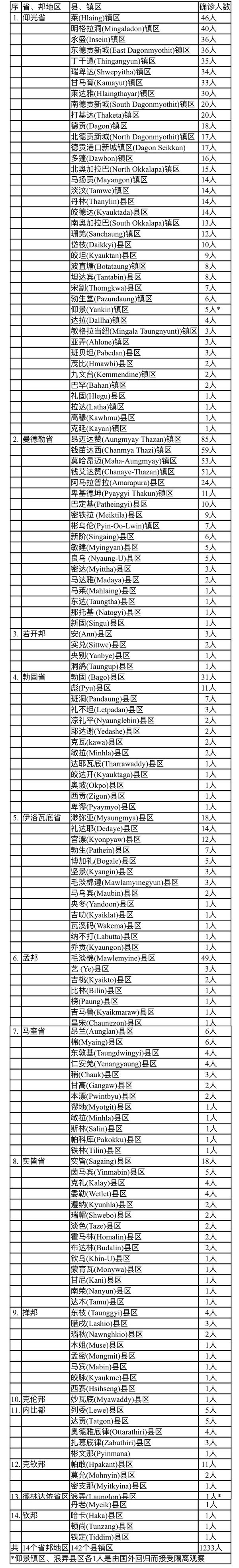 缅甸卫生暨体育部12月17日下午6时发出公告,通告12月16日这一天发现的1233名确诊者的一些情况。这1233名确诊者来自14个省邦地区,他们所属的县镇地区如下: