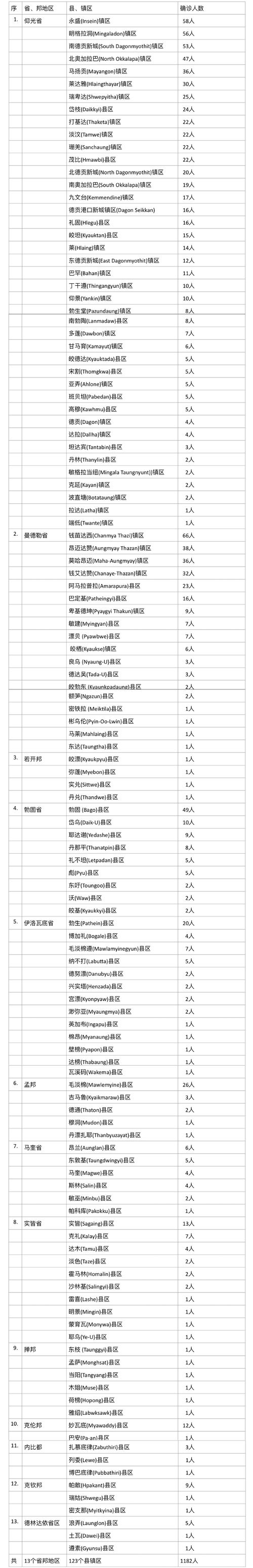 总计1182名确诊者来自13个省邦地区的123个县镇区(公告中曼德勒省德达吴县区重复出现2次),这当中有234人失去味觉。