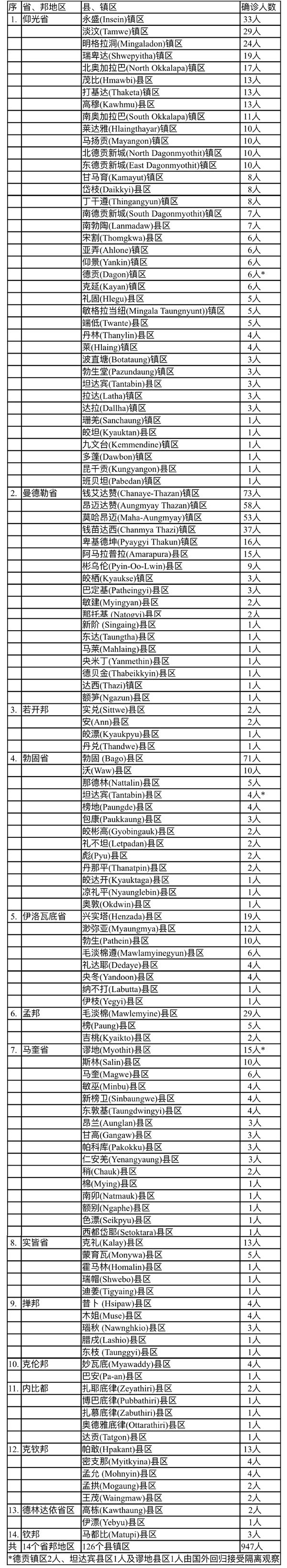 缅甸卫生暨体育部12月21日下午5时发出公告,通告12月20日这一天发现的947名确诊者的一些情况。这947名确诊者来自14个省邦地区,他们所属的县镇地区如下: