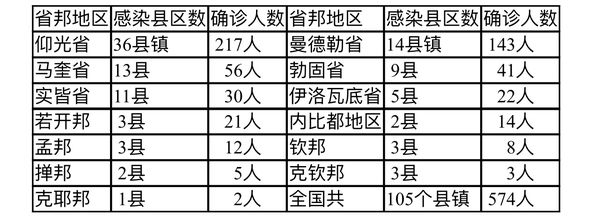 总计574名确诊者来自13个省邦地区的105个县镇区。