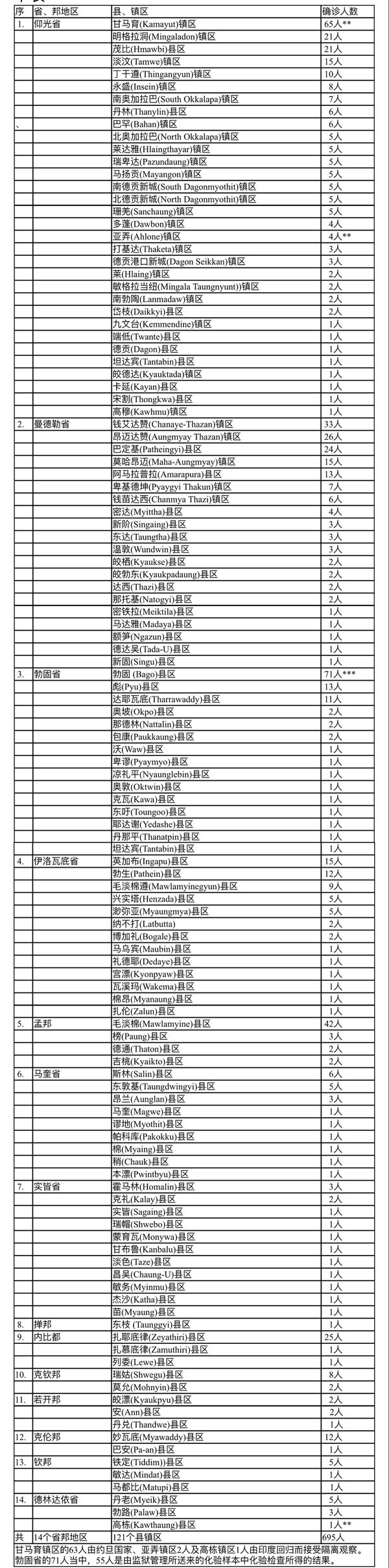 2021年1月3日发现的695名确诊者所属的省、邦及县区如下表: