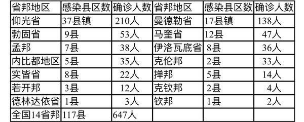 总计647名确诊者来自14个省邦地区的117个县镇区。