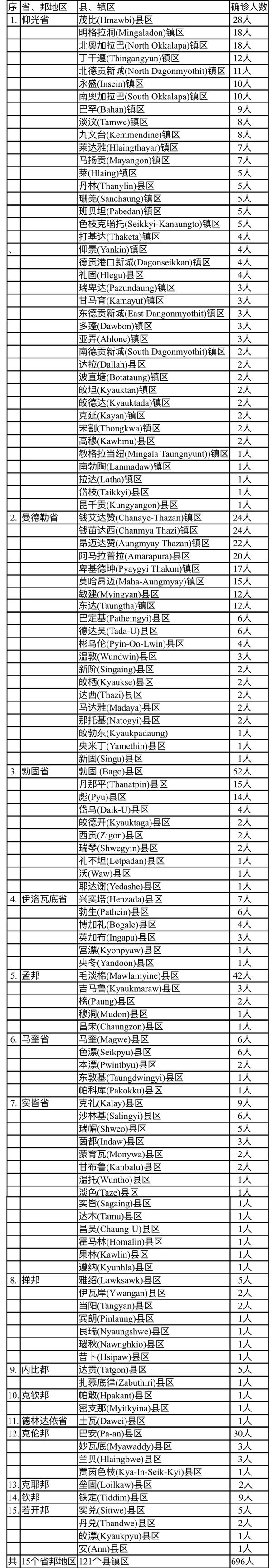 696名确诊者中,仰光省确诊人数223人,占总人数的32%,确诊人数比例及确诊人数总数都仍居全国第一位但已有明显地下降。确诊的县镇区总数为39个县镇区。确诊人数最多的县镇区茂比县区(28人),其余县镇区确诊人数已都降低到20人以下,仰光大都市的疫情应该说是已有和缓迹象,现在感染疫情的县区有32个县镇区的确诊人数在10人以下。各县镇的确诊人数都有相当程度的下降,而且这也是连续15天全省确诊人数在300人以下,只是是否能维持继续下降的趋势,还有待观察。
