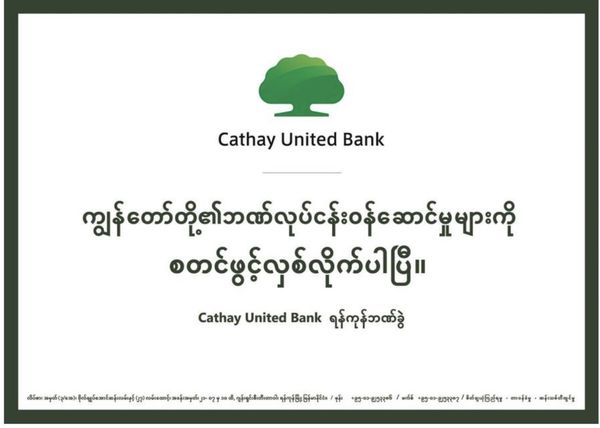 以上是官方报纸在1月9日的报导。但在官方报纸正式公布此消息的前一天,台湾Cathay United Bank仰光分行就已在1月8日的《缅甸之光》报上登出广告:“我们银行服务工作已开始了。”当时一些人还感到有些错愕:这到底是什么一回事?好在官方报纸在1月9日就公布这银行在1月6日就获准在缅设立分行的讯息,人们才算明白过来:既然1月6日就获准设立分行,1月8日在报上刊登广告公布开始业务工作,也是可以的了。
