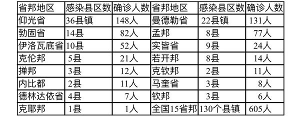 605名确诊者中,仰光省确诊人数148人,占全国确诊总人数的24%,确诊人数比例及确诊人数有所下降但仍居全国第一位。确诊的县镇区总数为36个县镇区。确诊人数最多的县镇区为北德贡镇区(17人),其余县镇区确诊人数都在12人及其之下,可说是降低了许多,仰光大都市的疫情应该说是已有和缓迹象,现在感染疫情的县区有32个县镇区的确诊人数在9人以下。各县镇的确诊人数都有相当程度的下降,有10个县镇区确诊人数都只有1人,而且这也是连续21天全省确诊人数在300人以下了。