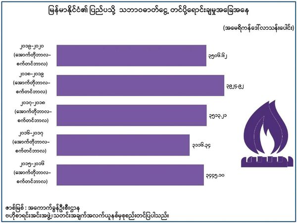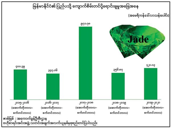 1月16日出版的《缅甸之光》刊登了两幅图表,介绍了最近几年缅甸天然气及玉石
