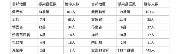 445名确诊者中,仰光省确诊人数101人,占全国确诊总人数的23%,确诊人数比例及确诊人数在全国范围中已不再居首位,而且连续5天“让位”给曼德勒省了。当日全省确诊的县镇区总数为34个县镇区。确诊人数最多的县镇区为马扬贡镇区11人,其余确诊人数均在10人及10人以下,而且有14个县镇区确诊人数只有1人,8个县镇区确诊人数只有2人,众多的镇区确诊人数都只剩下个位数,可见仰光省各县镇区的疫情都已在很大的程度和缓下来了。