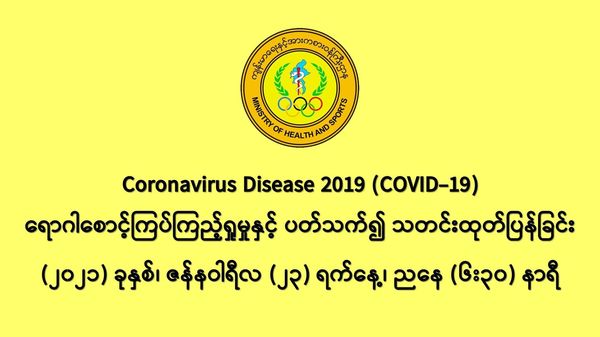 缅甸卫生暨体育部1月23日下午6时30分发出公告,通告缅甸自2020年3月23日发现第一名新冠疫情确诊者以来,一直到现在1月22日共发现疫情确诊者136,591人,这些人来自全缅甸15个省邦地区。其中1月22日这一天发现的 425名确诊者来自12个省邦地区,他们所属的县镇地区如下: