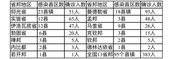 总计383名确诊者来自14个省邦地区的105个县镇区。