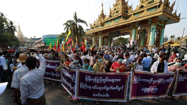 随后,星期一上午,缅甸军方发表简短声明称,根据宪法条款,将实施为期一年的紧急状态。军方电视台说,总统府宣布将国家权力移交给国防军总司令敏昂莱。