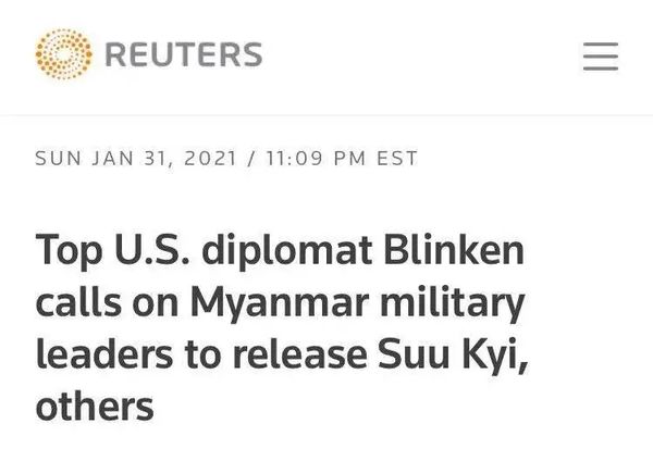 路透社刚刚消息,美国国务卿布林肯呼吁缅甸军方领导人,释放国务资政昂山素季及其他被扣押人士。