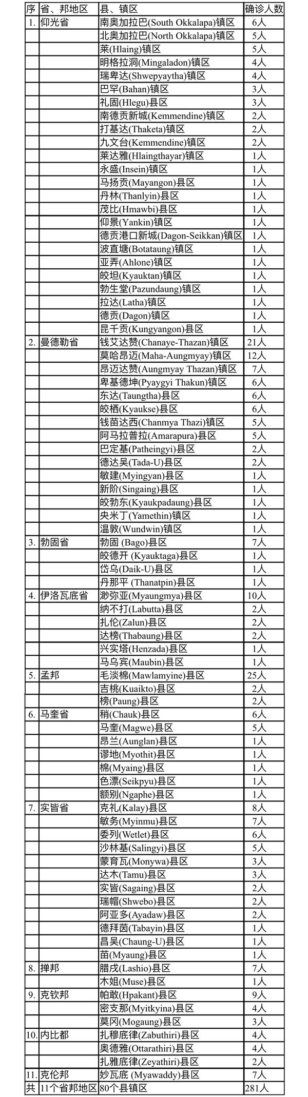 全国其他各省邦的疫情情况,曼德勒省15县区77名确诊者,确诊人数位居全国第一,曼德勒大都市的5个闹市区确诊人数51人,占全省确诊人数的71%,大都市的疫情还是不见和缓迹象。紧随曼德勒省后的是实皆省12县区41名确诊者,没有任何