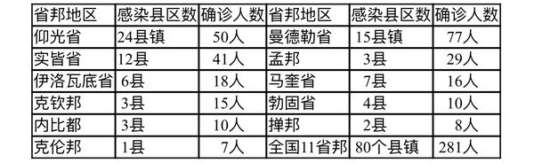 总计281名确诊者来自11个省邦地区的80个县镇区。