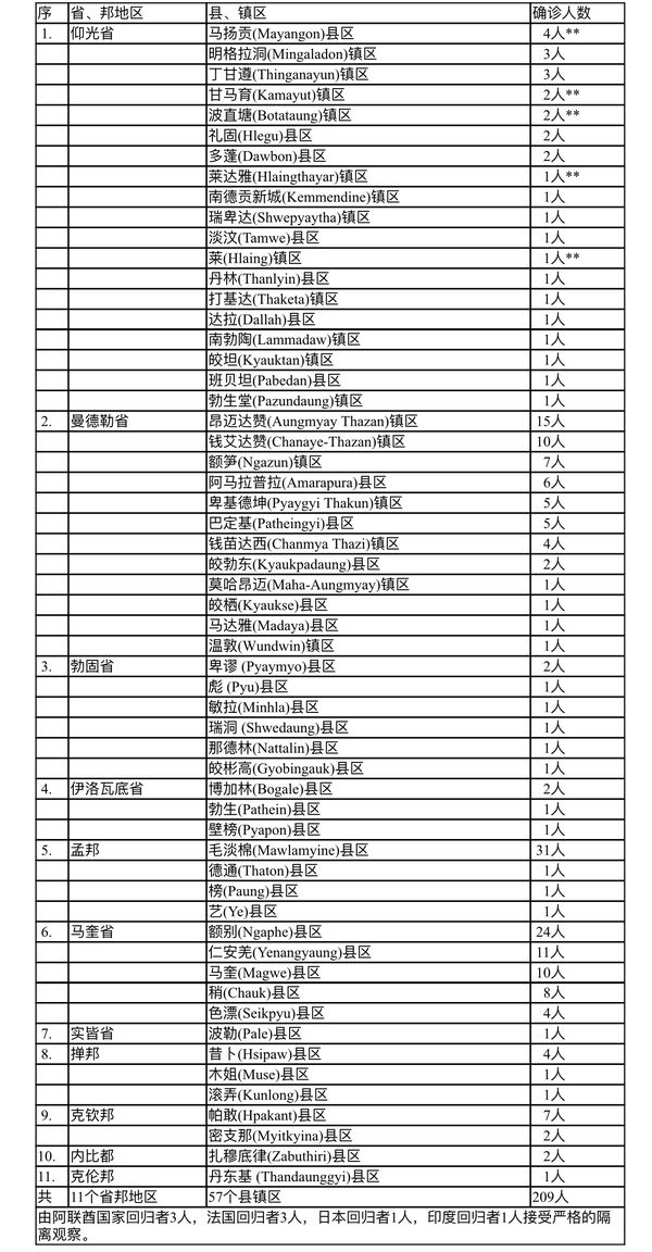 全国其他各省邦的疫情情况,曼德勒省12县区58名确诊者,确诊人数位居全国第一,曼德勒大都市的5个闹市区确诊人数35人,占全省确诊人数的60%,大都市的疫情还是不见和缓迹象。紧随曼德勒省后的是马奎省5县区57名确诊者,总确诊人数只比曼德勒省少1人,且确诊人数最多的额别县区确诊人数24人,其次是仁安羌县区11人、马奎县区10人,可见这些县区疫情蔓延情况还很严重。孟邦4县区34名确诊者,照旧是首府毛淡棉独占了31人。剩下的省邦中,克钦邦2县区9名确诊者,勃固省6县区7名确诊者,掸邦3县区6名确诊者,伊洛瓦底省3县区4名确诊者,内比都1县区2名确诊者,若开邦与克伦邦都是1县区1名确诊者,看起来各县区确诊人数都是“屈指可数”,但也有个别县区情况不可小觑,例如克钦邦玉石之乡帕敢县区单日确诊者仍有7人,就是一个例证。