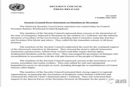 2021年2月4日(中国、缅甸时间:2月5日)联合国15个安全理事会国家一致通过关于缅甸问题的联合声明。声明中呼吁立即释放缅甸国务资政昂山素季以及总统吴温敏。并强调联合国安理会对缅甸民主进程,将给以支援。期望缅甸民众避免暴力,尊重人权遵纪守法。联合国安理会对东盟2月1日的声明表示支持。(之前说中俄否决的传言纯属谣言)