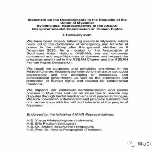 2021年2月5日东盟人权委员会发布了声明。该声明中,对缅甸局势表示关注。呼吁各方按照法律,进行和平协商,解决分歧。声明中说,希望看到缅甸民主的和平的曙光,这也符合缅甸人民的意愿。