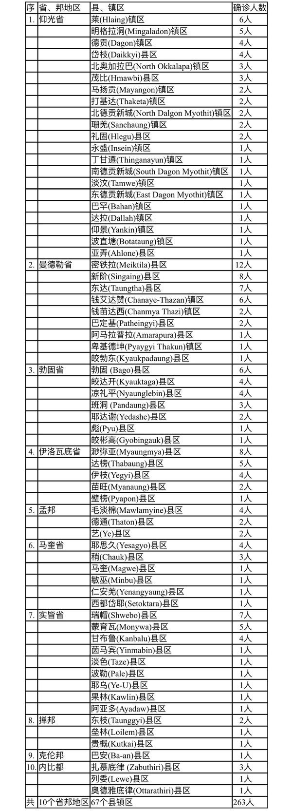全国其他各省邦的疫情情况,曼德勒省9县镇区40名确诊者,确诊人数位居全国第二,曼德勒大都市的5个闹市区确诊人数只有9人,且有2镇区该天是属于“零确诊”,大都市的确诊人数已有所下降且出现明显和缓迹象。紧随曼德勒省后的是实皆省9县区22名确诊者,且没有任何县区确诊人数超过7人。接下来的勃固省7县区21名确诊者,伊洛瓦底省5县区20名确诊者,马奎省6县区11名确诊者,孟邦3县区8名确诊者,内比都3县区5名确诊者,掸邦3县区4名确诊者,克伦邦1县区1名确诊者,几乎所有县区确诊人数都是“屈指可数”,这也在一定程度上说明全国各地疫情已出现和缓了。但是否会真正和缓,还得看以后几天确诊人数的蔓延情况。