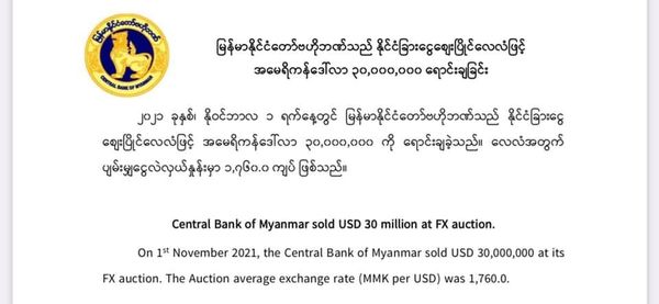 11月1日,缅甸中央银行本月首次在外汇拍卖会上出售了3000万美元。