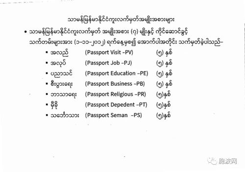 (三)各拥有五年期限的七种护照种类。(1、PASSPORT VISIT-PV旅游护照;2、PASSPORT JOB-PJ工作护照;3、PASSPORY EDUCATION-PE学习护照;4、PASSPORT BUSSINESS-PB商务护照;5、PASSPORT RELIGIOUS-PR宗教护照;6、PAEEPORT DEPENT-PT家属护照;7、PASSPORT SEMAN-PS海员护照)。