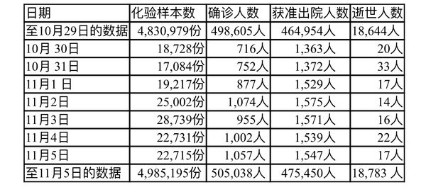 缅甸卫生部10月30日至11月5日每晚8时时所公布的疫情情况分别如下: