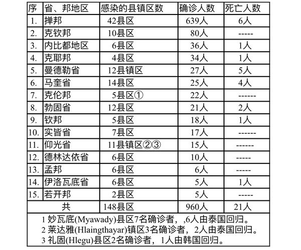 缅甸卫生部再于11月7日下午5时发布的公告,全国各省邦11月6日的确诊人数共为960人,死亡人数21人,具体数据如下表: