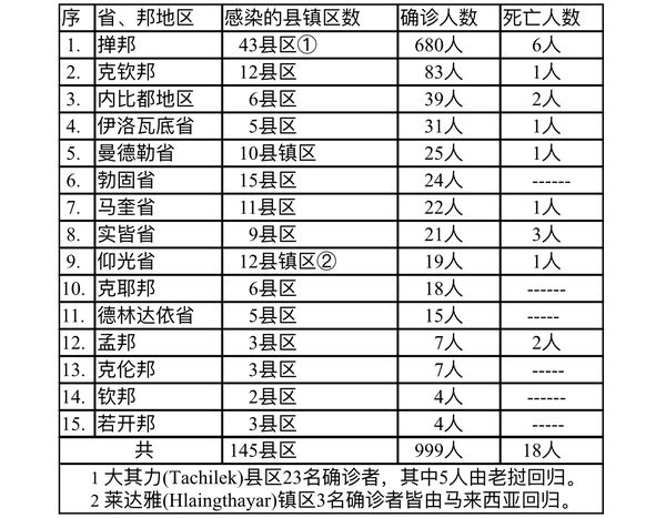 缅甸卫生部于11月9日下午4时发布的公告,全国各省邦11月8日的确诊人数共为999人,死亡人数18人,具体数据如下表:
