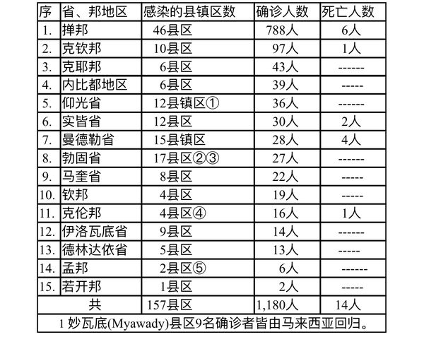 缅甸卫生部于11月11日下午4时发布的公告,全国各省邦11月10日的确诊人数共为1180人,死亡人数14人,具体数据如下表: