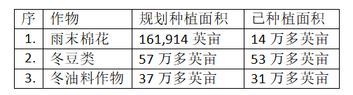这些庄稼作物按季节种植,为使这些庄稼作物达到规定的指标产量,省、专区及县农业局等都给予各种赞助,县、专区级农业局职工们也会下到农田上去进行各项宣导工作。目前冬作物种植季节期间,全省主要种植的作物为雨末棉花。各种豆类及油料作物等。各种作物 规划种植面积及目前完成的种植面积如下表: