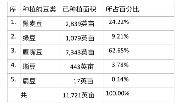 目前完成种植工作的豆类中,就以鹰嘴豆种植面积为最多,占所有豆类种植面积的八分之五以上的比例,其次是黑麦豆,种植面积将近全部豆类种植面积的 ¼ 比例。