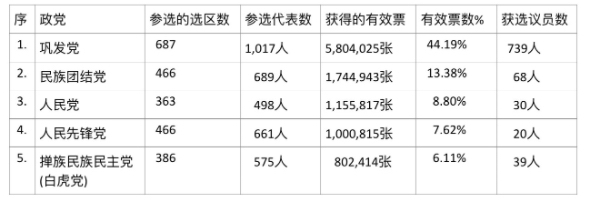 正如选前许多人所预估的那样,联邦巩固与发展党(巩发党)在这次大选中遥遥领先,“一花独秀”、“力压群芳”,在全国的1025个选区(包括人民议院、民族议院及省邦议院)中,在739个选区获胜。几个主要政党所获得的选票数、获选议员人数等如下表: