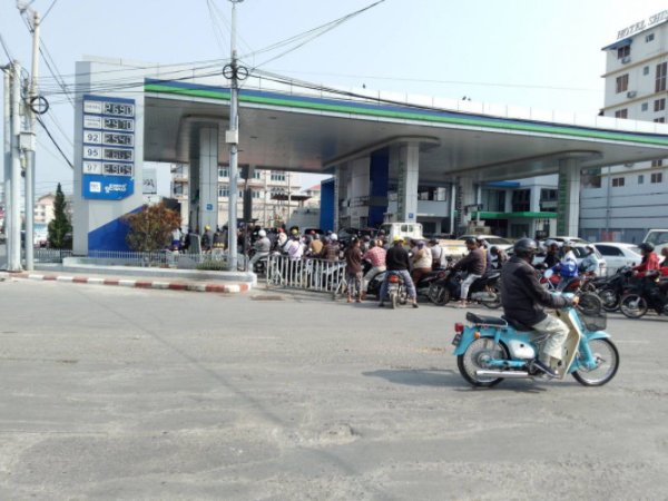 由于泰国方面停止向邻国输送燃油,缅甸掸邦东部多个城镇的民众开始担忧燃油短缺,纷纷排队购油。