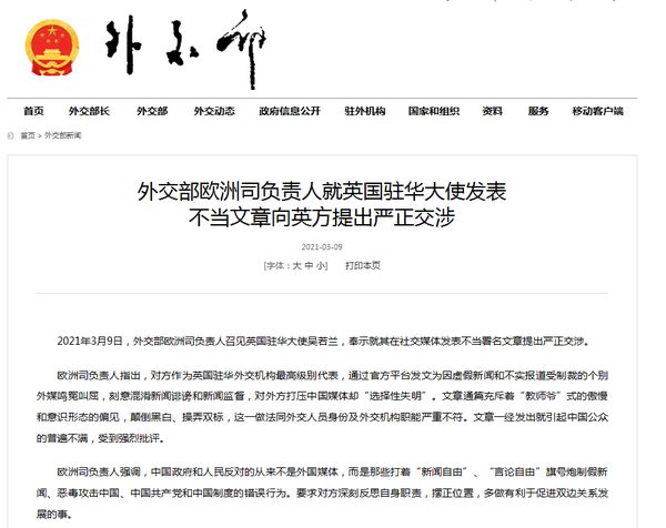 2021年3月9日,外交部欧洲司负责人召见英国驻华大使吴若兰,奉示就其在社交媒体发表不当署名文章提出严正交涉。