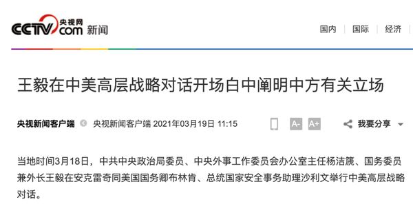 当地时间3月18日,中共中央政治局委员、中央外事工作委员会办公室主任杨洁篪、国务委员兼外长王毅在安克雷奇同美国国务卿布林肯、总统国家安全事务助理沙利文举行中美高层战略对话。