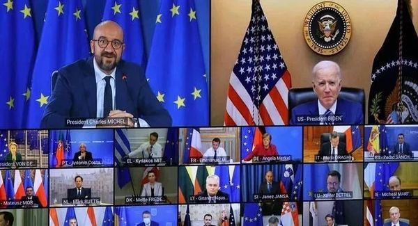 ▲欧盟峰会于3月25日以视频形式召开。除了欧盟各国领导人,此次峰议也是2009年以来美国总统首次参加的欧盟峰会。拜登和欧洲盟友们共商“重振美欧关系”,这其中,也包括了对华外交政策的“共同利益”。