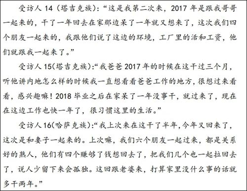 可以看出,新疆少数民族群众出疆务工完全是自主选择;平等就业、劳动报酬、节假日休假、休息日休假等劳动权利都得到了充分保障;饮食习惯、子女教育、探亲休假和往返交通等方面得到了更多照顾。