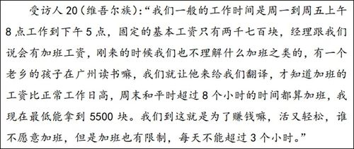 尼罗拜尔和陈宁的调研报告显示,在内地务工的新疆少数民族工人每天正常的工作时间大多为8个小时(部分技术类岗位工作时间更短),分为白班和夜班两个班次,在企业订单较多时会在法律规定范围内有额外的加班,除了加班和夜班有额外的工资和补贴,技术类岗位也有绩效工资。
