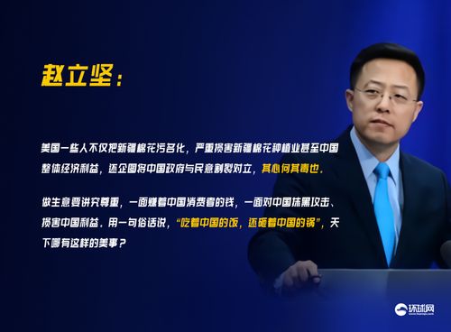 回到新疆棉花的话题,赵立坚强调,做生意要讲究尊重,一面赚着中国消费者的钱,一面对中国抹黑攻击、损害中国利益。用一句俗话说,“吃着中国的饭,还砸着中国的锅”,天下哪有这样的美事?