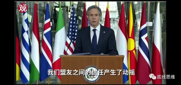 当地时间3月23日,美国国务卿布林肯前往比利时首都布鲁塞尔参加了北约外交部长会议。他坦言,“我们盟友之间的信任产生了动摇”(观察者网视频截图)