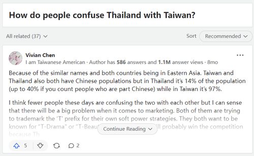 据笔者查阅,“搞不清泰国和中国台湾”的美国人并不只有CNN一家,在美国著名问答社交媒体Quora上,就有专门讨论“为什么人们分不清泰国和台湾地区”的问题。