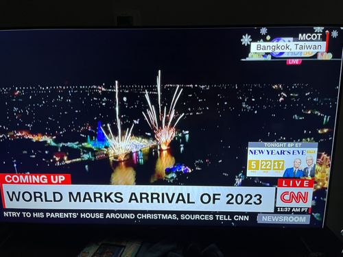 因此,在好几分钟的时间里,CNN新闻字幕都如上图这样写着“泰国首都庆祝2023新年”,但转播画面却是我国台湾地区台北市的夜景。