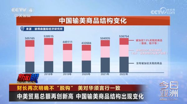 另一方面,中美贸易也出现了新的变化:同样是来自美国智库的研究显示,2017-2022年,中国对美出口中,被加征25%关税的商品出口额大幅减少,这部分商品包括芯片、家具和部分家电产品等;被加征7.5%关税的商品出口额小幅减少,这部分商品以服装、鞋子为主;没有被加征关税的商品出口额呈现出上升的趋势。