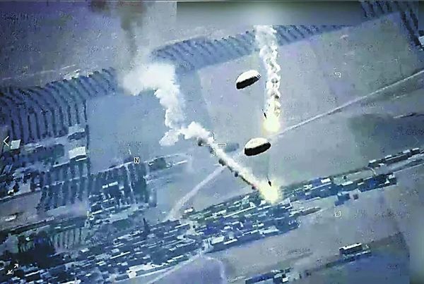 图片说明:当天俄战机释放带降落伞的专用干扰弹的画面。