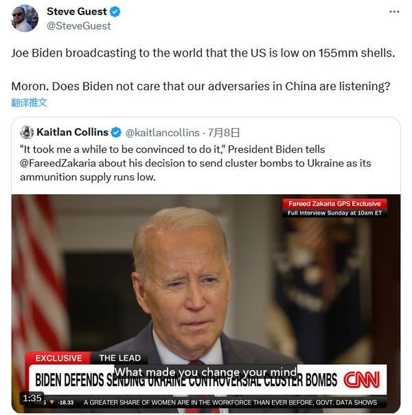 报道称,拜登受访时随口就“泄露”了一个与美军相关的“潜在敏感事实”——美国弹药短缺,美保守派人士对此猛烈抨击。而中国又莫名“躺枪”,美播客主持人史蒂夫·盖斯特(Steve Guest)指责拜登脱口而出本应属于国家机密的信息,大骂道:“太愚蠢了,他都不担心中国会听到吗?”