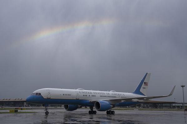 7月6日,耶伦乘机抵达北京时,天空刚好出现一道彩虹。图源:视觉中国
