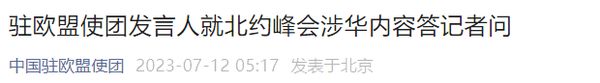 驻欧盟使团发言人就北约峰会涉华内容答记者问问:日前举行的北约维尔纽斯峰会发布联合公报,……
