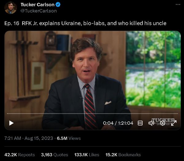 有多红呢?当卡尔森于15日(北京时间)把他专访肯尼迪的完整视频放出后,这段视频在短短1天里就在美国社交网络平台X(推特)上获得了650万的播放、13万点赞和4万次转发。