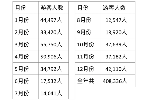 在全年内,以3月份、4月份期间游客人数为最多,其次是12月份期间的游客人数。游客人数最少的月份是雨季期间7月、8月时期。